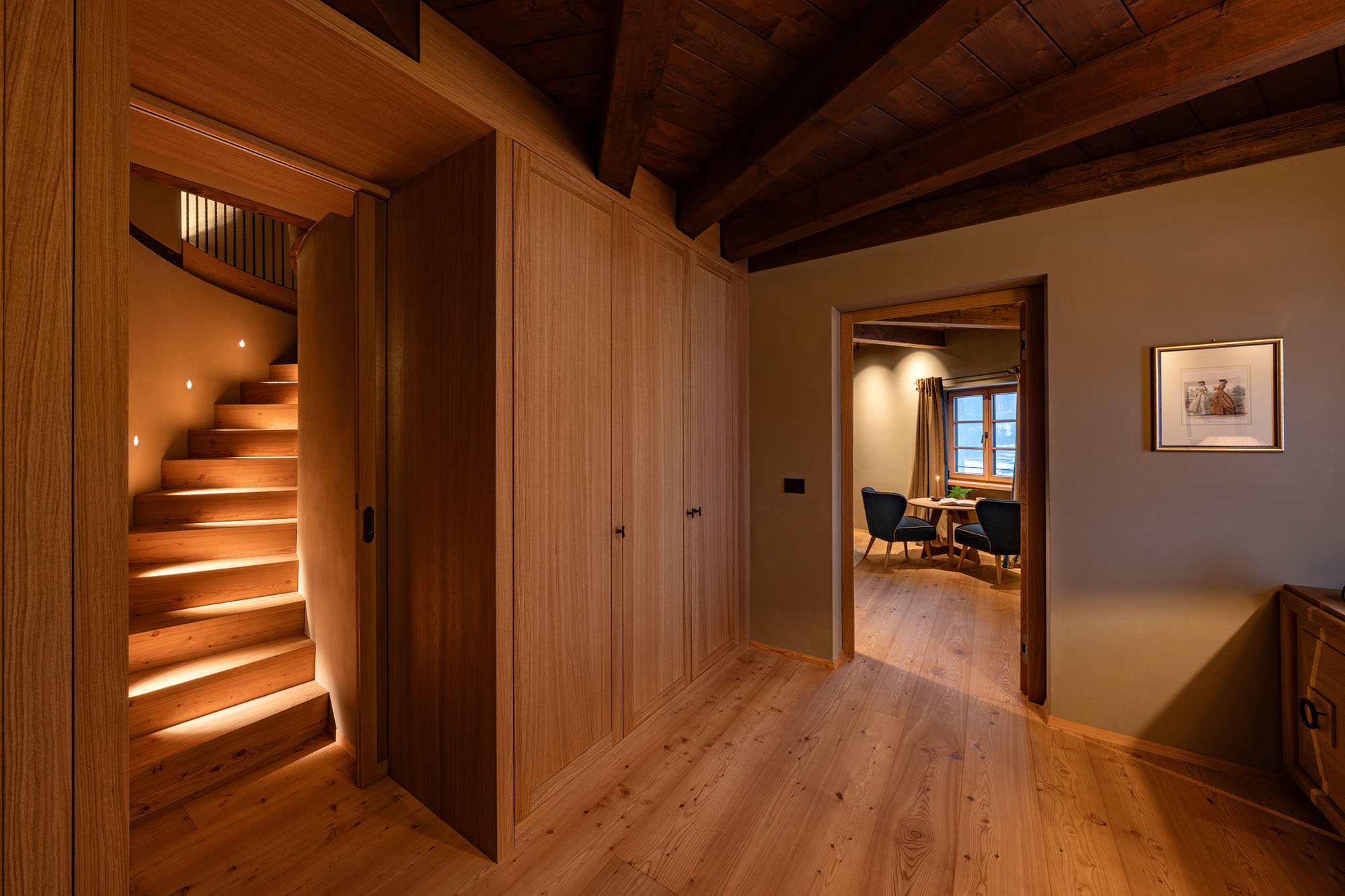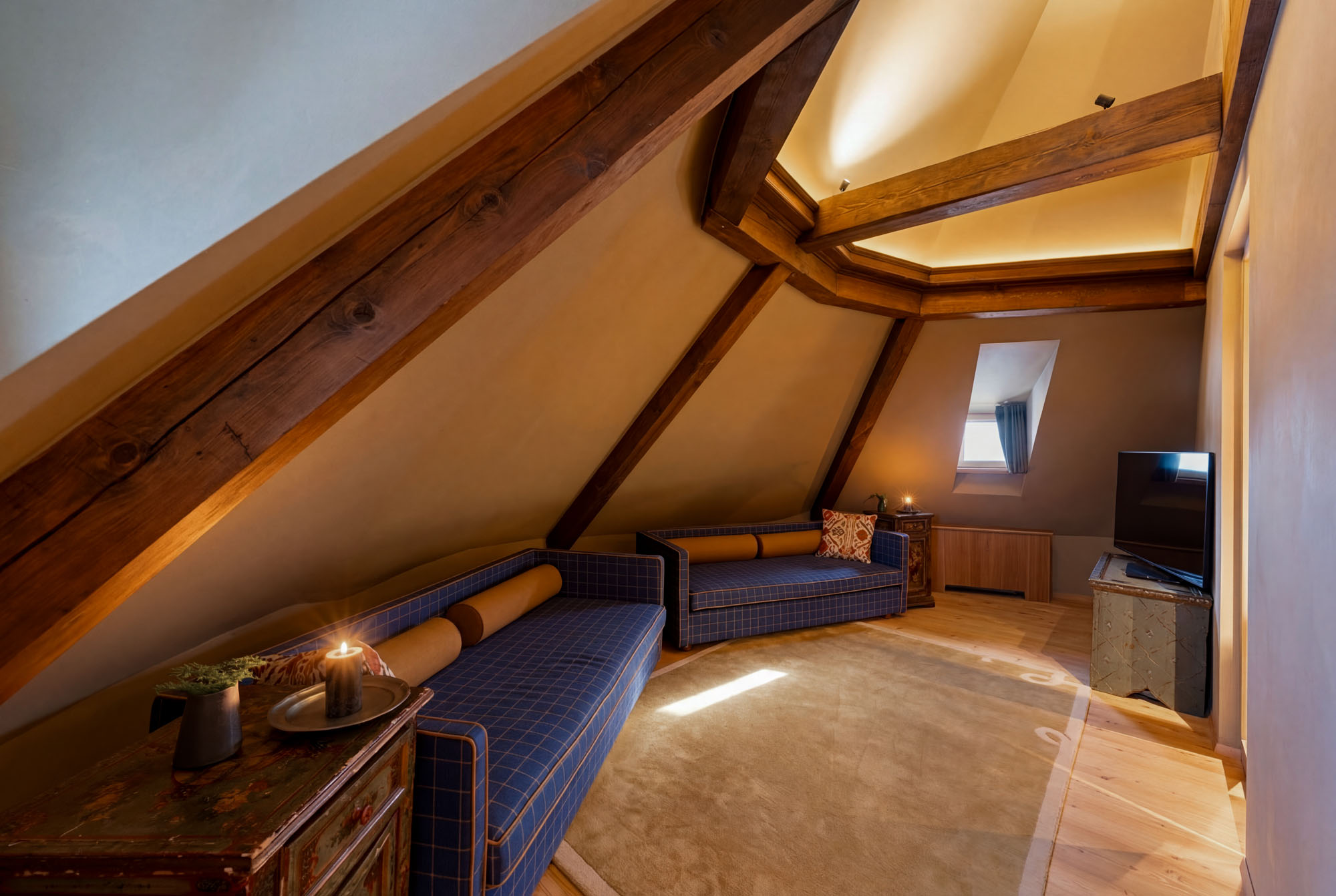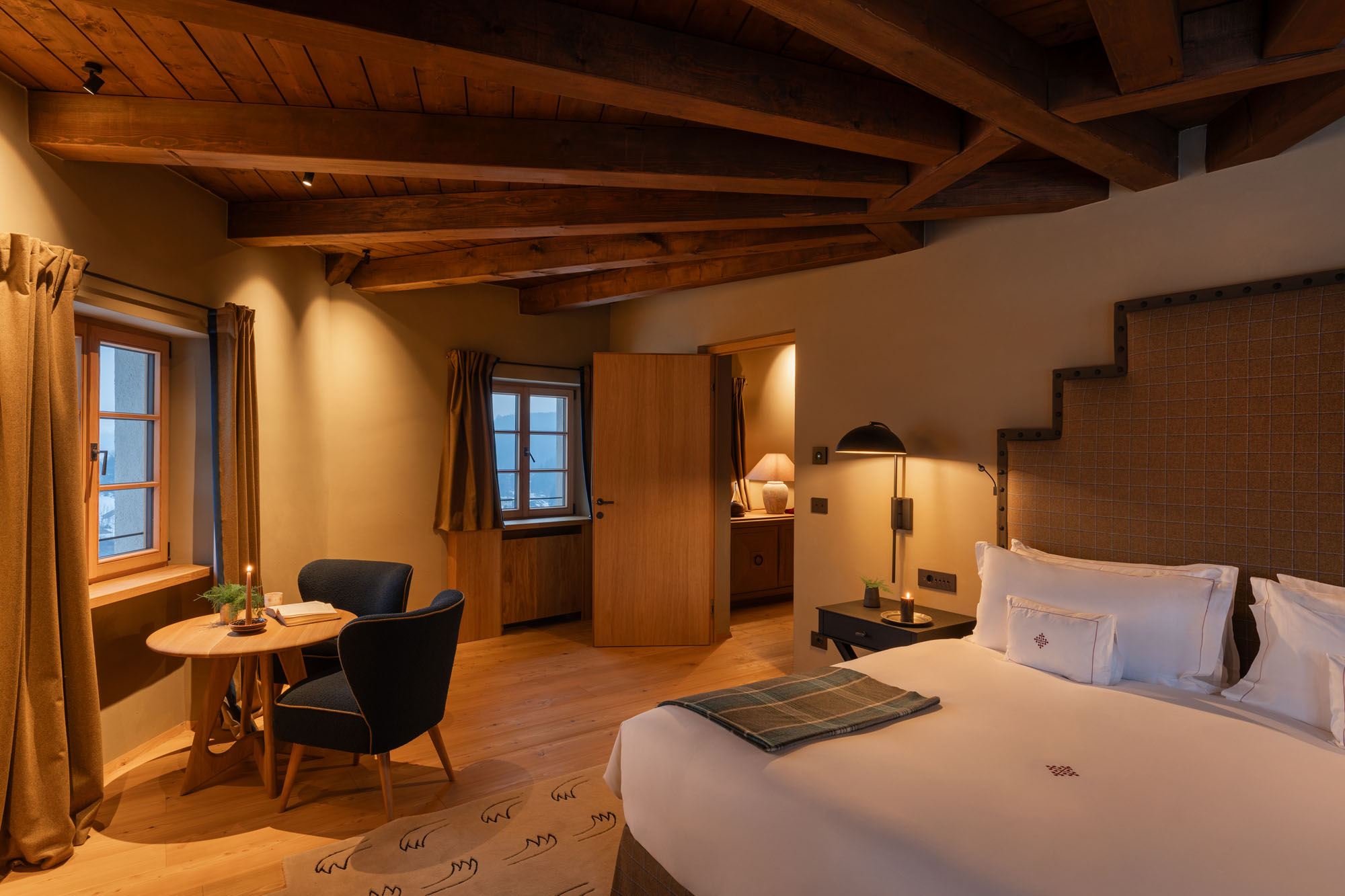 Nestled within an ancient castle tower and arranged over two levels, the Meravigliosa is suspended between history and the present. Carefully preserved original architecture meets contemporary alpine furnishings, creating a space that belongs to no specific era and redefines the perception of time. The suite includes a double bedroom and, on the upper floor, a private lounge that can be converted into a second double bedroom on request, accommodating up to four guests. Surrounding views over the Dolomites stretch endlessly, framing moments of rest, pause or conviviality. The lounge features an in-room bar corner with hot beverages and drinks, while the bedroom includes a spacious private bathroom with walk-in shower and bathtub, for a secluded wellbeing experience immersed in history.