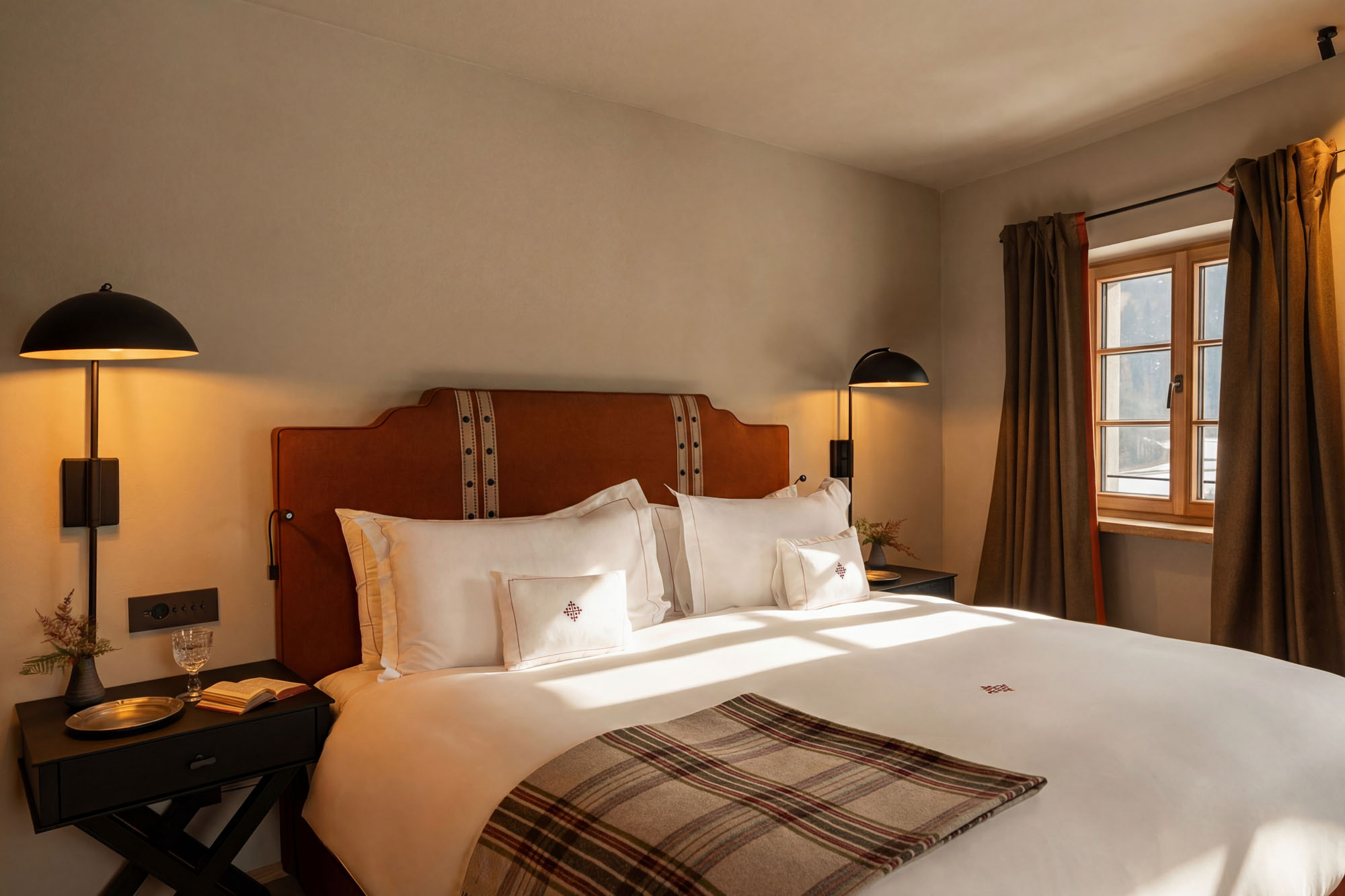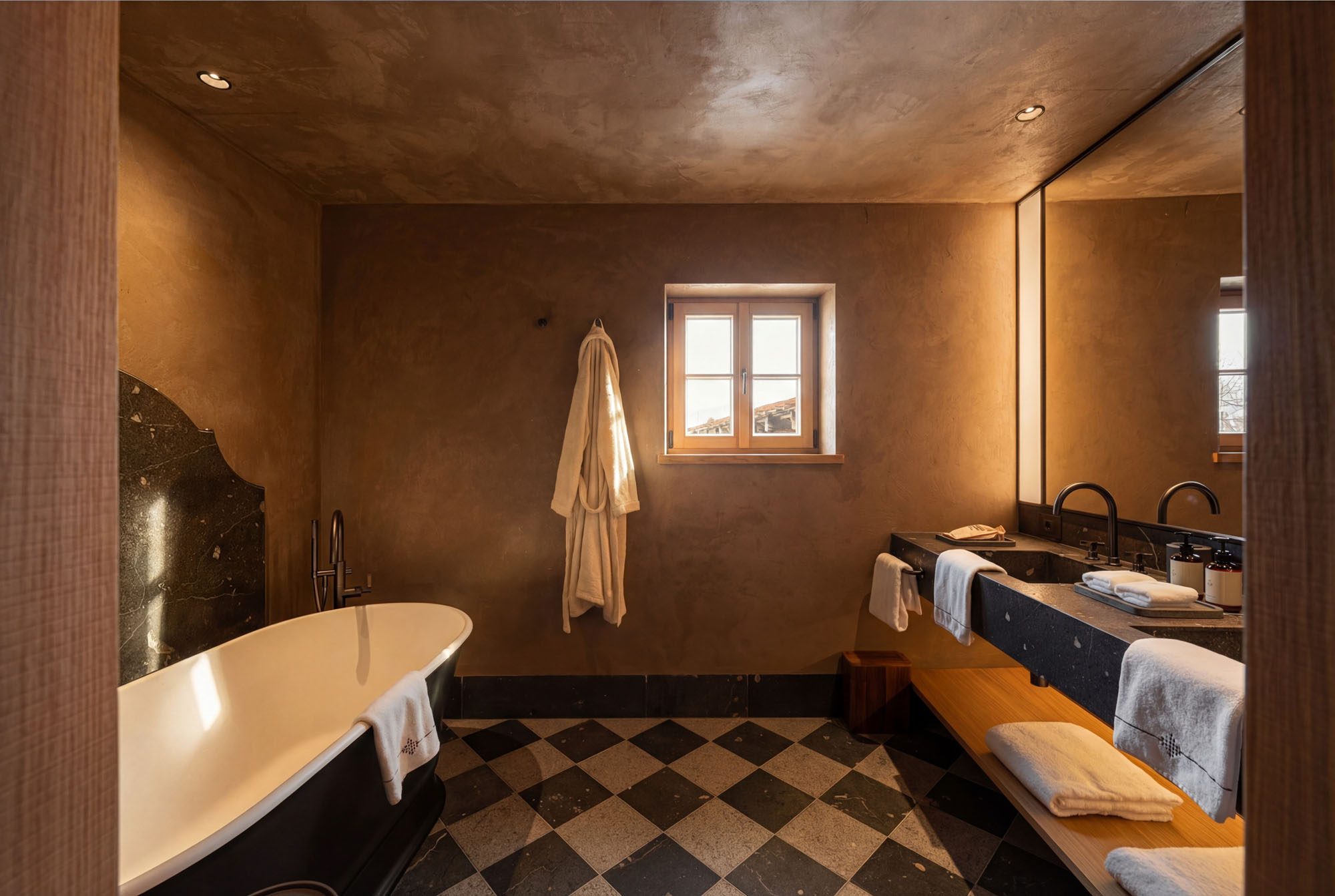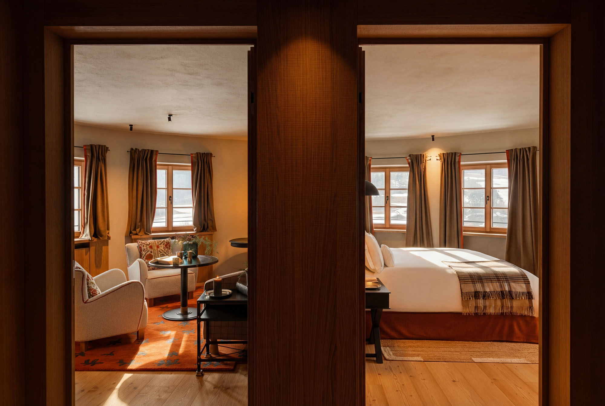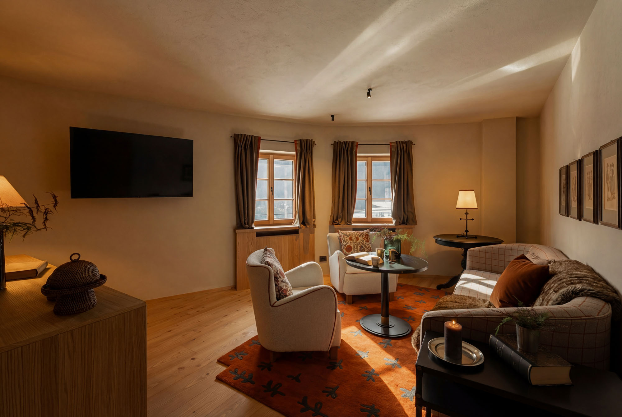 Located on the first floor, both suites offer a peaceful refuge in the Dolomites. A separate bedroom, a private living area and the option of one or two additional beds allow accommodation for up to four guests. Alpine textures and colours harmonise with historic elements such as local stone, arrow slits and, in one suite, the structure of an ancient tower. The living area separates rest from social moments, with views over the courtyard and surrounding mountains. An in-room bar corner with hot beverages and soft drinks invites moments of relaxation. Wellbeing is completed in spacious bathrooms with walk-in rain showers and bathtubs. One of the two suites also features a private sauna.